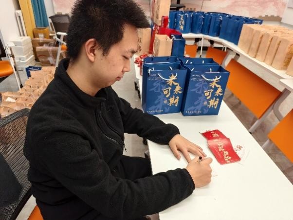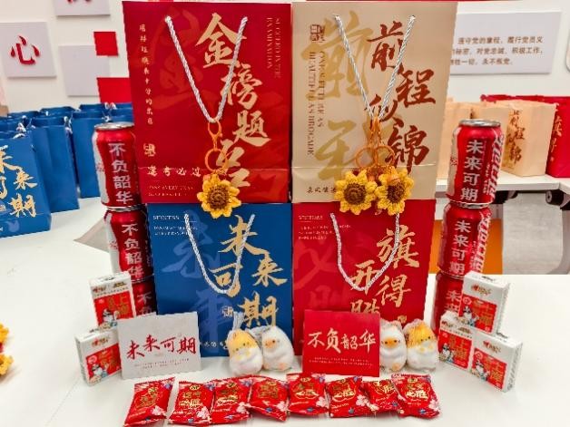 为贴合考研学子冲刺阶段的实际需求,学院精心筹备了兼具实用性与寓意感的定制福袋,将关怀藏进每一个细节里。福袋内不仅包含祝福贺卡,更搭配了多重“助力好物”:不仅有补充备考能量的零食,还有缓解焦虑情绪的解压小玩具以及象征“向阳而生、逐梦不止”的向日葵钥匙扣。这些寄托着学院对学子们勇敢追梦、不负韶华的美好祝愿。从物资采购、分类搭配到细致打包,工作人员全程用心筹备,让每一份福袋都装满“沉甸甸”的关怀,为学子高效备考提供坚实后盾,助力他们轻装上阵赴考场。