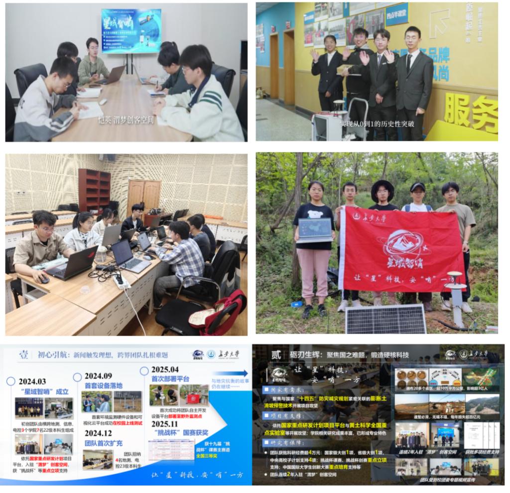 北斗系统成功预警黄土滑坡、实现人员零伤亡的事迹,深深触动了一批来自灾害多发地区的学子,在他们心中埋下了“用科技守护生命”的理想火种。三年后的春天,在中国地球物理学会青年大会上,这群青年与当年参与预警研究的黄观文教授相遇,共同信念就此凝聚,“星域智哨”团队正式组建。团队历经三次发展,形成了“7+4+5”的跨年级、跨学科人才梯队。依托国家重点研发计划平台,整合地测、信息、电控等多学院优势,团队连续入驻“渭梦”创客空间,累计获得国家级大创、“挑战杯”重点立项等经费支持超4万元,逐步从一颗初心的种子,成长为一支扎根现实、响应国家战略的青年科研力量。