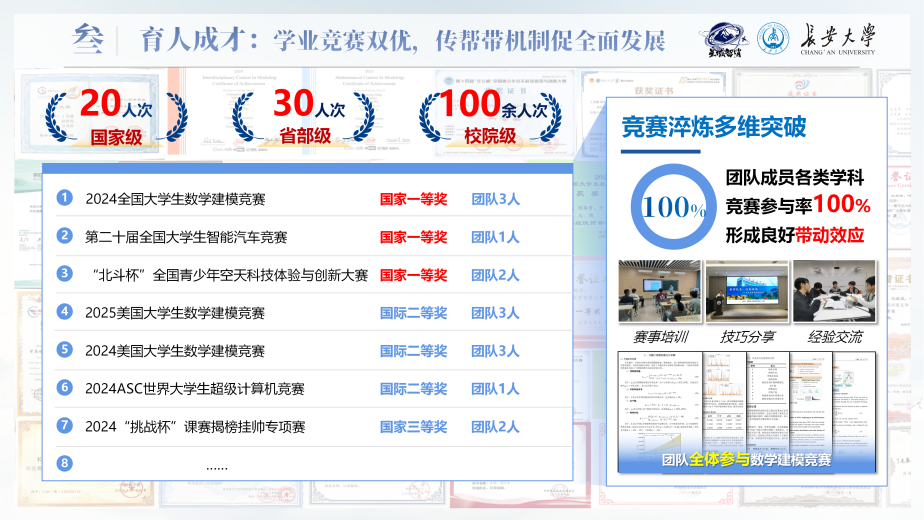在学科竞赛中,团队成员斩获2024全国大学生数学建模竞赛一等奖(近两届全校唯一)、第二十届全国大学生智能汽车竞赛一等奖(近两届全校唯一)、“北斗杯”全国一等奖(连续两届)等多项国家级重要奖项,累计获得省级及以上荣誉奖项50余人次,展现出卓越实力。